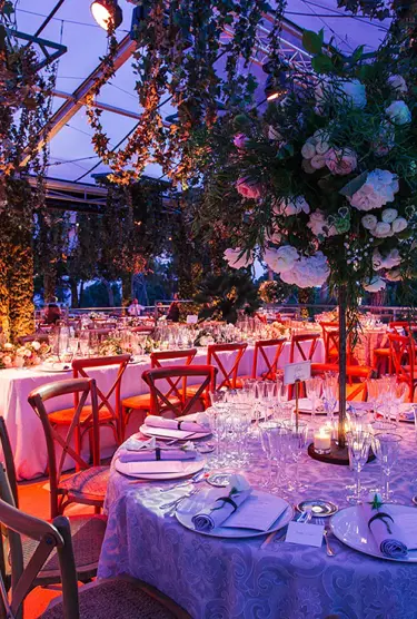 Gerade bei Hochzeitsfeiern ist das gemeinsame Erleben der verbindende Faktor. Mit unseren transparenten Dach- und Wandbekleidungen sorgen wir für einen scheinbar nahtlosen Übergang ins Freie und einen ungehinderten Blick auf den Nachthimmel.