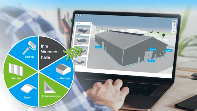 Ab hier ist es nur noch ein kleiner Schritt zu Ihrer individuellen Halle. Den Hallentyp, die Abmessungen und Ausstattung Ihrer Wunschhalle können Sie einfach und bequem online konfigurieren. Wir zeigen Ihnen, wie es geht.