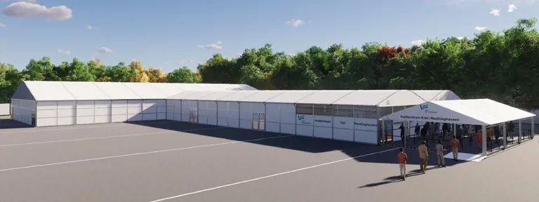 Für den Bau des mobilen Impfzentrums beauftragte der Landkreis die Spezialisten von Losberger De Boer. Diese entwickelten ein umfassendes Hygiene-Konzept, welches unter anderem eine nächtliche Stoßdesinfektion sowie eine spezielle Be- und Entlüftung der Räumlichkeiten vorsieht.