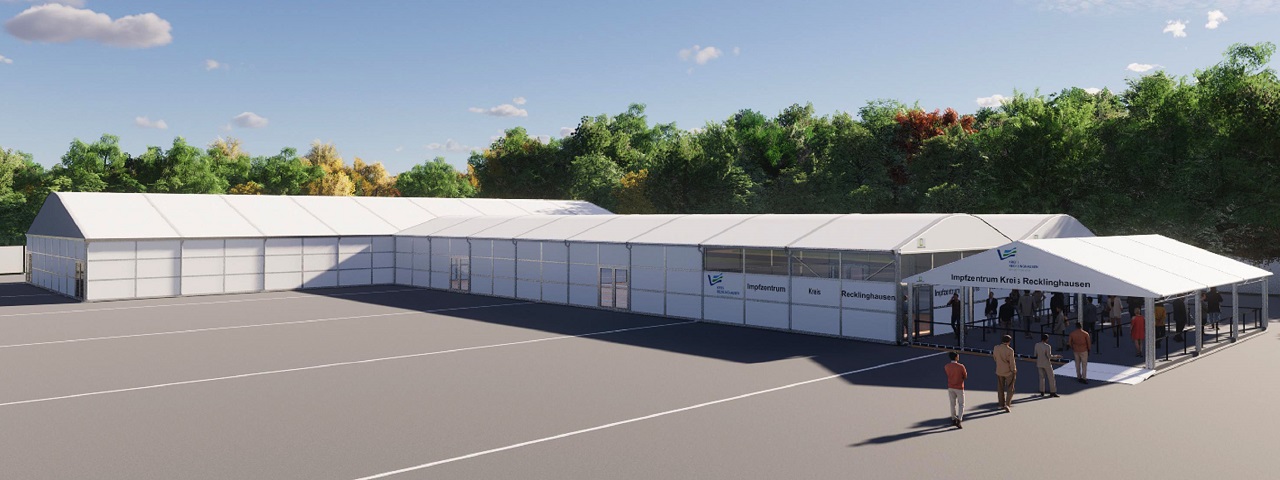 Über 10 Sattelzüge an Material, 30 Monteure im Einsatz, 4 modulare Hallen zu einem Komplex verbunden – die Vorbereitungen auf dem Konrad-Adenauer-Platz in Recklinghausen laufen auf Hochtouren. Landrat Bodo Klimpel beschreibt das Projekt wie folgt: „Wir errichten hier eines der größten Impfzentren in Nordrhein-Westfalen, das bis zum 15. Dezember betriebsbereit sein soll. Unser Ziel ist, dort pro Tag 2.000 Impfungen durchführen zu können.“