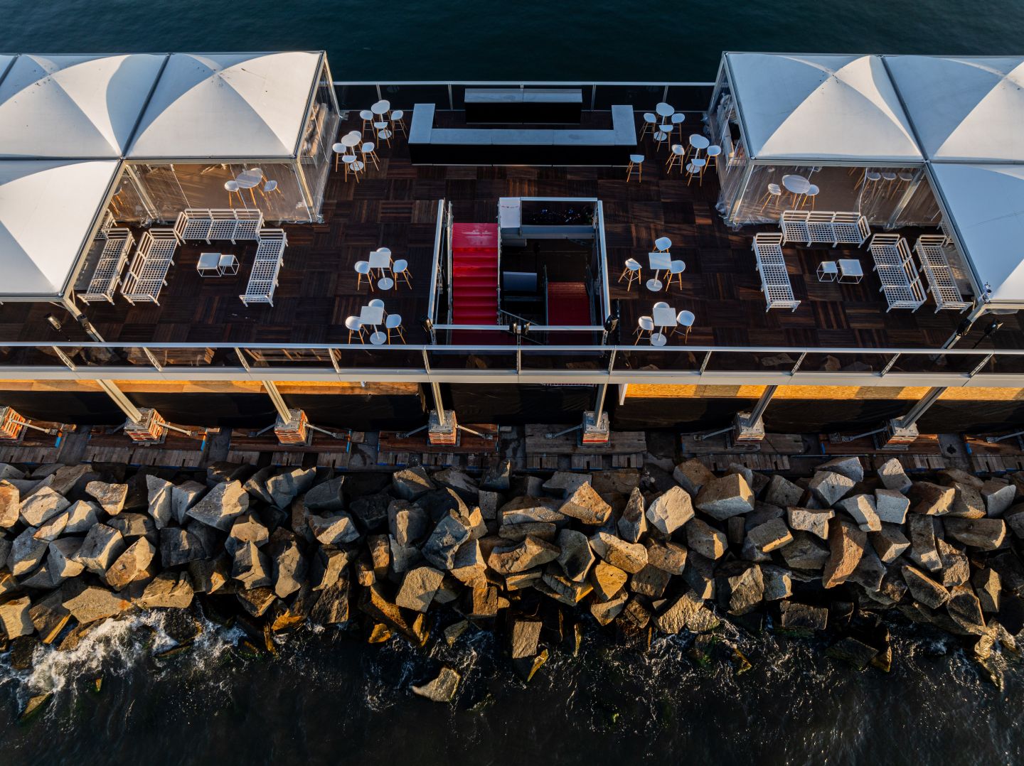 Das Ergebnis war ein zweigeschossiges Hospitality-Gebäude mit 360°-Blick auf die Regattastrecke und die Stadt. Geschützte Indoor-Lounges wurden mit einer Außenterrasse direkt über dem Wasser kombiniert und schufen so ein exklusives Gesamterlebnis.