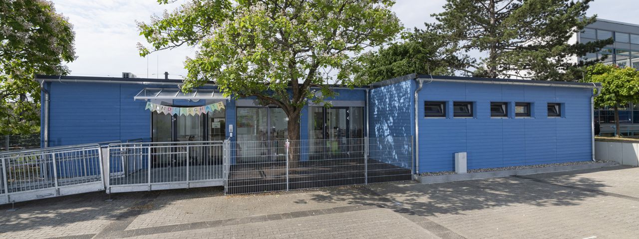 Insgesamt besteht das Gebäude aus 12 Modulen des Typs 3001 Plus. Damit konnte eine helle und einladende Kindertagesstätte realisiert werden. Neben einem offenen Eingangsbereich stehen den Kindern und Betreuern zukünftig ein Sanitärraum, Betreuungsraum und Verwaltungsraum zur Verfügung. Am Eingang wurde eine Rampe für einen barrierefreien Zugang integriert. Die Terrasse öffnet sich in den Innenhof des Schulgeländes. Das gesamte Gebäude ist mit einer blauen Holzfassade verkleidet und passt sich so optisch perfekt in das Gelände ein.
