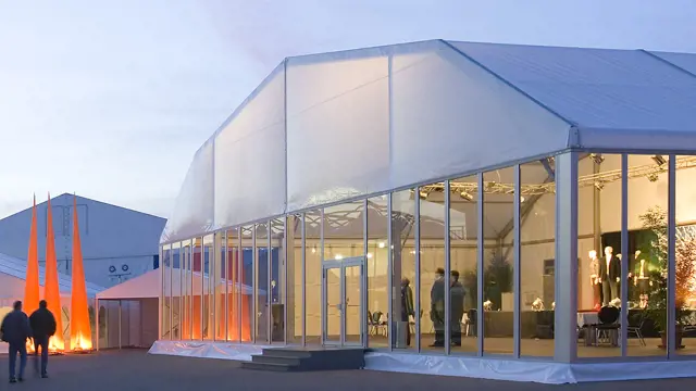 Die Polygonale besteht aus einer hochwertigen Aluminiumkonstruktion und einer Dachmembran aus PVC, die diese Zelthalle extrem flexibel und vielseitig machen. Sie kann auf Ihre individuellen Bedürfnisse und Anforderungen zugeschnitten werden und bietet Ihnen den Raum, den Sie brauchen, um Ihr Business am Laufen zu halten – und das zu geringen Kosten. Mit freitragenden Spannweiten bis zu 40 m und einer Firsthöhe bis 14 m, können Sie auch Ihre ambitioniertesten Lager- und Logistikprojekte realisieren.