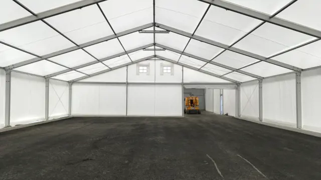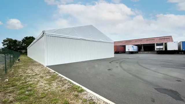 Le chapiteau industriel Tradistock offre une solution légère d'abri et de stockage. La structure est composée d'une charpente aluminium et d'une toiture en membrane PVC composite ultra résistante. La bâche de toit apporte une luminosité naturelle ainsi qu'une acoustique confortable.