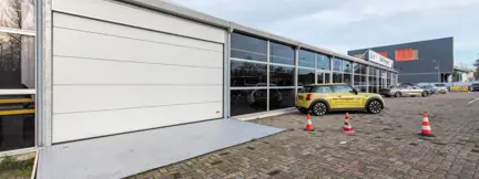 In 2,5 week tijd werd een showroom van 1000 m2 gerealiseerd. Onze Anova structuur werd hiervoor aangepast met onder meer een brede overhead-deur, zodat de BMW’s en MINI’s eenvoudig de showroom binnen konden worden gereden. Ook hebben we geïsoleerde dak- en zijwandpanelen aangebracht.