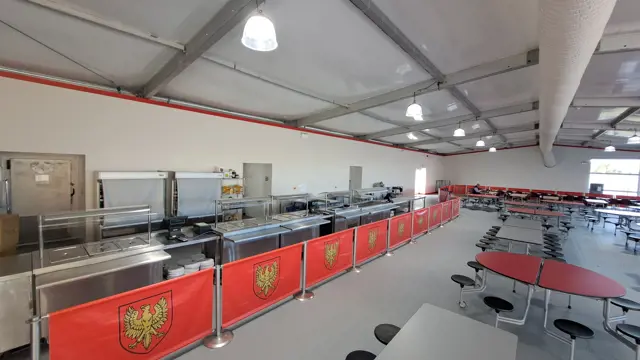 We werkten nauw samen met het keukenpersoneel om ervoor te zorgen dat de indeling voor hen zou werken, zodat het interieur kon worden uitgerust met alle benodigde apparatuur. We hebben het geheel ook afgewerkt in de merkkleuren van de school om de tijdelijke ruimte in lijn te houden met de oude kantine.