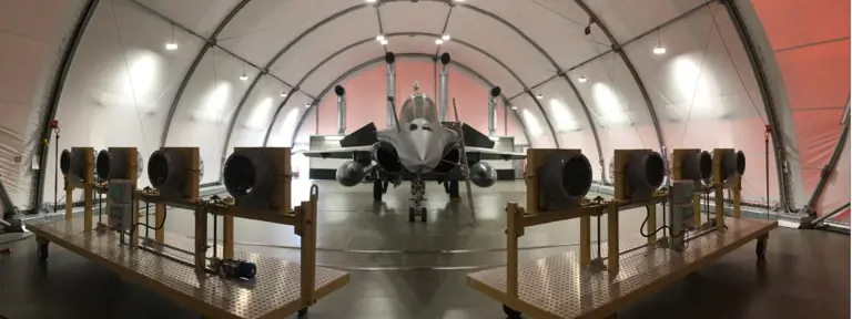 De modulaire structuur van Losberger De Boer is uitgerust met omkeerbare airconditioning, drogers, verwarming en een luchtfiltersysteem, waardoor de gevechtsvliegtuigen het hele jaar door onder ideale én milieubeschermende omstandigheden kunnen worden voorzien van hun verflaag.
