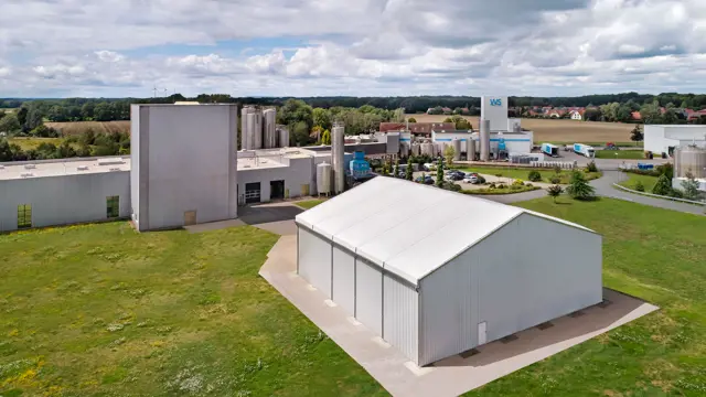 Voor een voedingsmiddelenproducent in Nedersaksen zorgde Losberger De Boer met de ProStock-hal voor een snelle uitbreiding van de opslagcapaciteit. Om tijdens een aanpassing van het productassortiment de druk op het droog- en koelmagazijn te verlichten, had Warmsener Spezialitäten GmbH voor 36 maanden een extra opslagruimte nodig voor verpakkingsmateriaal. In juli 2023 begon het ervaren team van Losberger De Boer met de opbouw van deze 25 x 25 meter grote tijdelijke hal, die op funderingen werd geplaatst met het oog op geplande bestratingswerkzaamheden in het interieur. De hal, zes meter hoog, werd voorzien van stabiele zijwanden van trapeziumplaat, een thermisch geïsoleerd dak en een elektrisch bedienbare roldeur voor optimale veiligheid. Warmsener Spezialitäten prees vooral de soepele communicatie, de snelle opbouw en de directe ondersteuning bij technische vragen – deze factoren maakten de samenwerking met Losberger De Boer tot een groot succes.