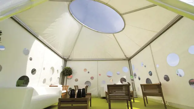 The Cumulus has a cubic shape that adds a breath of fresh air to any event, thanks to its open character and its inflatable roof membrane. Its aluminium frame ensures robustness and safety.